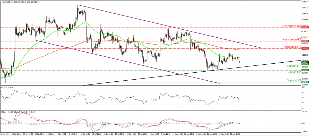 sr20detgt 1,468 Report post Posted September 2, 2014 GOLD USD 02 09 2014 • Gold declined yesterday, and today during the European morning it seems ready to challenge the support level of 1280 (S1), which lies slightly above the long-term upside support line (black line) drawn from back at the low of the 30th of December. The metal is also trading within the purple downside channel connecting the highs and the lows on the daily chart. However, given our proximity to a strong support area, I would remain neutral for now. Only a clear and decisive dip below 1273 (S2) could turn my attention to the downside. Such a move could pave the way for the 1260 (S3) zone. On the upside, a rebound near the aforementioned black line is likely to aim for another test near the 1297 (R1) hurdle. • Support: 1280 (S1), 1273 (S2), 1260 (S3) • Resistance: 1297 (R1), 1305 (R2), 1320 (R3) CR : http://www.forex-tri...al-Analysis.php 1 Quote Share this post Link to post Share on other sites
