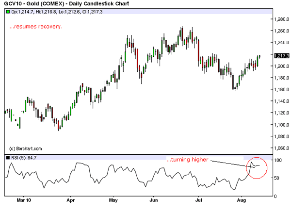 NeoSeemadong 52 Report post Posted August 15, 2010 GOLD: Bullish Recovery Resumes Analysis | Commodity Technical Analysis | Written by FXTechStrategy | Sat Aug 14 10 03:41 ET GOLD: Bullish Recovery Resumes GOLD: Having halted its three-day declines and triggered higher prices on Thursday, risk of further strength is now likely targeting the 1,217.90 level, its July 13’10 high. A clearance of there will open the door for more gains towards the 1,265.05 level, its 2010 high and possibly higher. Its daily RSI is bullish and pointing higher supporting this view. However, if pullbacks materialize, we should see further weakness targeting the 1,203.98 level, its July 23’10 high with a cut through there allowing for more downside towards the 1,166.15 level, its Aug 02’10 low. Further down, support resides at the 1,156.80 level. All in all, Gold has triggered a recovery higher and now eyes the 1,217.90 level and beyond. Quote Share this post Link to post Share on other sites