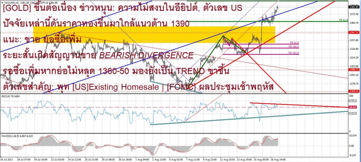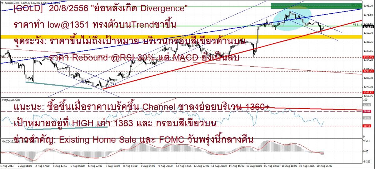 Bet the Future 4 Report post Posted August 20, 2013 ทองคำ 20/8/2556 บ่าย ย่อแล้วนะครับในระยะ 1H เกิดจาก Bearish Divergence ด้านบน การย่อลงมอง Trend ใหญ่น่าซื้ออยู่ หาจังหวะ เบรคกรอบขาลงย่อยแล้วซื้อตาม หรือ ซื้อตอนนี้ ดู CUT LOSS บริเวนสีเหลือง พรุ่งนี้มีตัวเลขและประกาศผลประชุม FOMC นะครับ Quote Share this post Link to post Share on other sites
