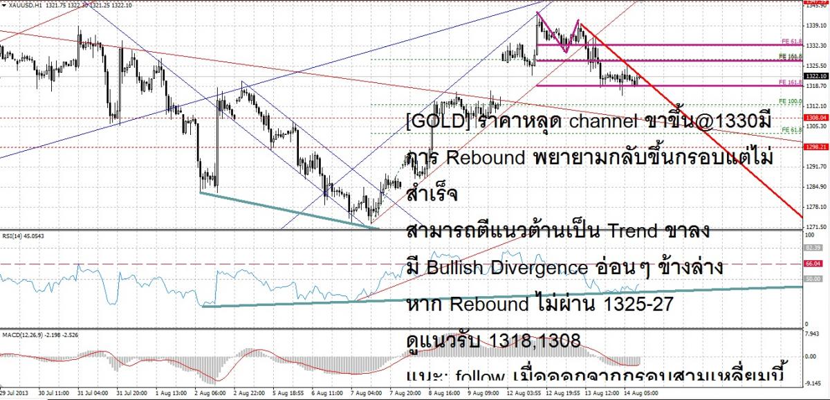 Bet the Future 4 Report post Posted August 14, 2013 [GOLD] ราคาหลุด channel ขาขึ้น@1330มีการ Rebound พยายามกลับขึ้นกรอบแต่ไม่สำเร็จ สามารถตีแนวต้านเป็น Trend ขาลง มี Bullish Divergence อ่อนๆ ข้างล่าง หาก Rebound ไม่ผ่าน 1325-27 ดูแนวรับ 1318,1308 แนะ: follow เมื่อออกจากกรอบสามเหลี่ยมนี้ 1 Quote Share this post Link to post Share on other sites