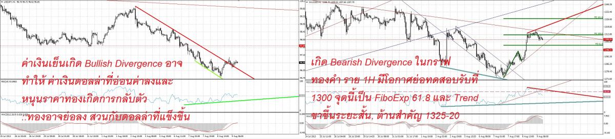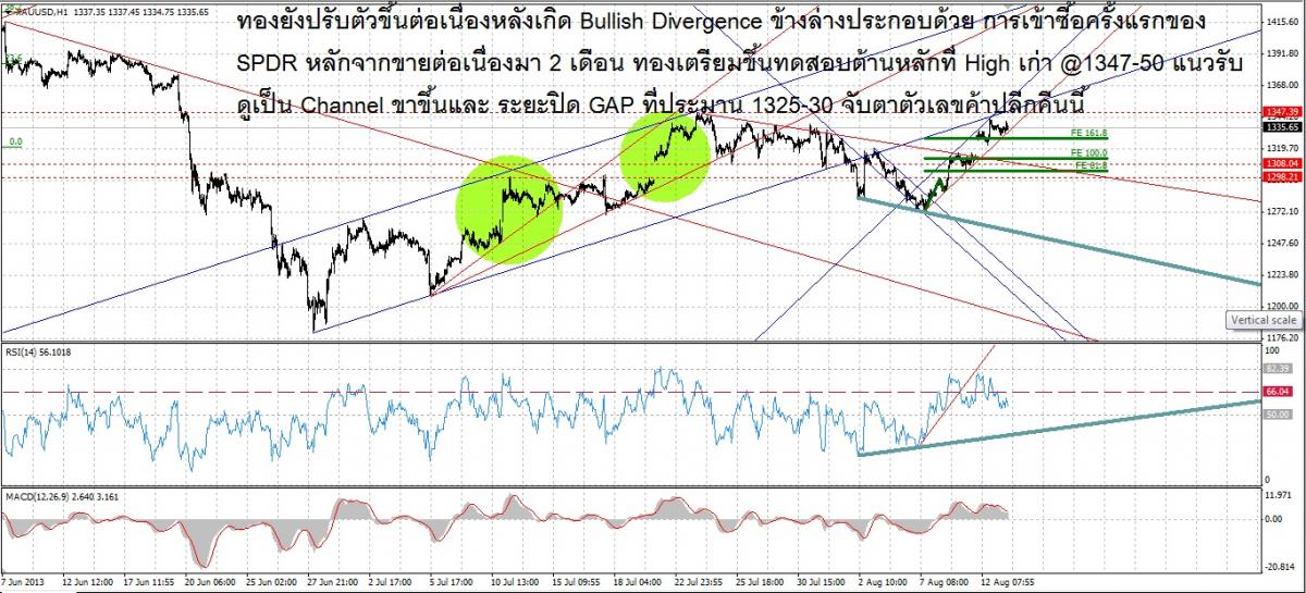 Bet the Future 4 Report post Posted August 8, 2013 สวัสดีครับ ชาวบอร์ด ThaiGold ทุกคน ผมชื่นชอบการเก็งกำไร ไม่ว่าจะเป็น ทองคำ commodity อื่นๆ หรือ equity ณ ที่นี้อยากเสนอมุมมองต่อการเคลื่อนไหวของราคา ด้วยความรู้และประสบการ์ณที่สะสมมา หวังว่าจะมีประโยชน์ต่อส่วนรวมนะครับ ติดตามราคาอื่นๆ นอกจากทองคำได้ใน link นะครับ facebook.com/BetFuture เริ่ม post แรกผมขอเสนอ bullish divergence ราคาและสัญญานซื้อขายในกราฟทองคำ ราย 1H ภาพนี้เกิดขึ้นเมื่อวาน 7/8/2556 ตอนบ่ายนะครับ และหลุด รับหลักที่ ทำ lower low แต่ สัญญาน RSI และ MACD นั้นไม่ลงไปต่ำกว่าเดิม เป็นสัญญานให้ซื้อขึ้นมานะครับ แต่ระวังการ clear divergence หากราคาลงต่ำกว่า low เก่า การ rebound ในกรอบขาลงต้องติดตามใกล้ชิดเพราะ หากเปลี่ยนทางต้องรีบขาย เป้าหมายในการ rebound คือขึ้นไปใกล้เคียง 1300 คือจุดแนวรับเก่า แนะ: L ตรงนี้ 1280 ขาย 1295-1300 Cut Loss L ถ้าหลุด 1270 1 Quote Share this post Link to post Share on other sites