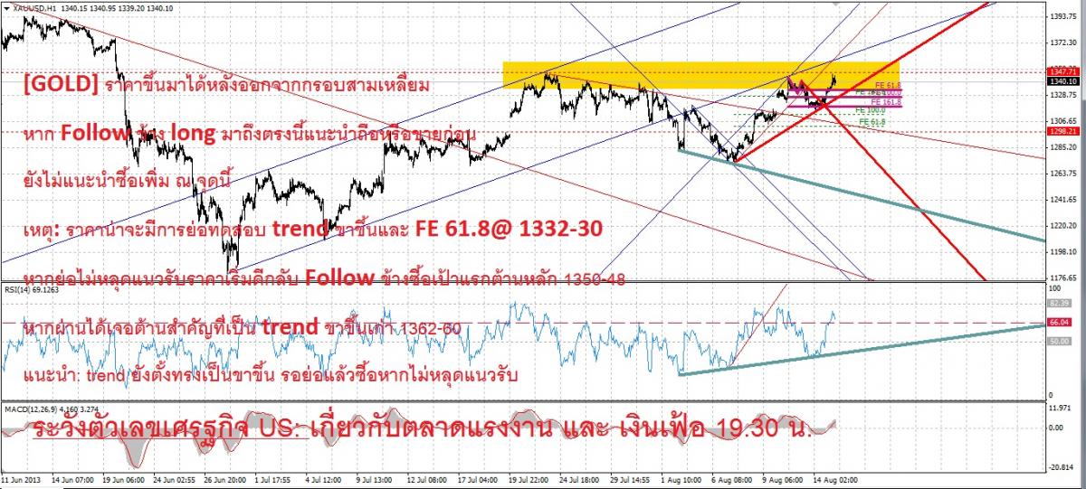 Bet the Future 4 Report post Posted August 15, 2013 [GOLD] ราคาขึ้นมาได้หลังออกจากกรอบสามเหลี่ยม หาก Follow ข้าง long มาถึงตรงนี้แนะนำถือหรือขายก่อน ยังไม่แนะนำซื้อเพิ่ม ณ จุดนี้ เหตุ: ราคาน่าจะมีการย่อทดสอบ trend ขาขึ้นและ FE 61.8@ 1332-30 หากย่อไม่หลุดแนวรับราคาเริ่มดีกลับ Follow ข้างซื้อเป้าแรกต้านหลัก 1350-48 หากผ่านได้เจอต้านสำคัญที่เป็น trend ขาขึ้นเก่า 1362-60 แนะนำ: trend ยังตั้งทรงเป็นขาขึ้น รอย่อแล้วซื้อหากไม่หลุดแนวรับ ปล. คืนนี้ตัวเลข US: ตลาดแรงงาน และ เงินเฟ้อ Quote Share this post Link to post Share on other sites
