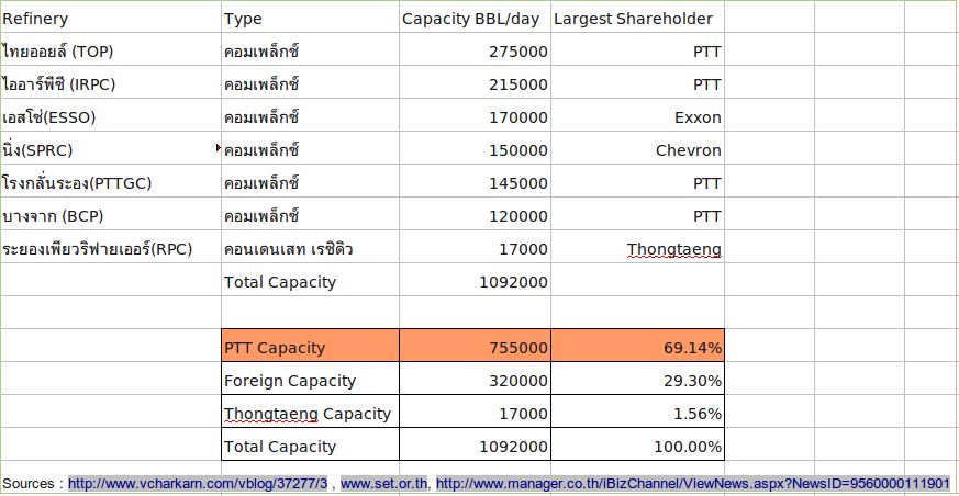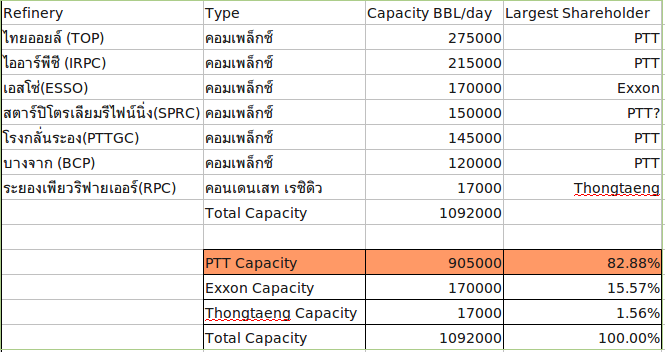 mdaddy 2,443 Report post Posted December 6, 2013 (edited) ให้ตายเถอะ.. "ปู่เต่าทึ่ม" นี่เป็นชื่อที่ผมชอบจริงๆ ๕ ๕ ๕ ๕ ขอบคุณสำหรับความรู้ และข้อคิดครับคุณหมีน้ำ - กรณี "บิดเบือน" ราคาน้ำพลังงาน จุดนี้เราอาจจะมองไม่เหมือนกัน แต่ผมมองว่า นโยบายภาษี และกองทุนน้ำมัน เอาไว้ใช้บิดเบือนราคาเป็นหลัก (ส่วนจะบิดเบือนเพื่อเหตุผลดี หรือไม่ดี อันนี้เป็นอีกเรื่อง) แต่เมื่อมีการบิดเบือนแล้ว ไม่ใช่ตลาดเสรีแน่นอนครับ - กรณีกองทุนน้ำมัน ก็เป็นอย่างที่คุณหมีน้ำว่าครับ ว่ามันเคยใช้ได้ผลจริง (ซึ่งผมมองว่าเป็นยาชา) แต่พอเจอเทรนด์หนักๆ ยาชาก็เอาไม่อยู่ครับ - ผมดูข้อมูลของวันที่ ๔ วันเดียว (ไม่ได้ดูเป็นซีรี่ส์) ไม่เห็นกองทุนน้ำมันมาอุดหนุน กาซธรรมชาตินะครับ แถมมีต้องจ่ายเข้ากองทุนเสียด้วย พลังงานที่ได้รับการอุดหนุนจากกองทุนฯ คือ ดีเซล อี๒๐ และ อี๘๕ เท่านั้นครับ - เห็นด้วยครับ ว่านโยบายฯเป็นตัวทำให้น้ำมันแพง ... แต่ผมก็ได้สรุปไว้ว่า ถ้าอยากเทียบว่า ป. ไหนโขกลูกค้ามากกว่ากัน... ต้องเทียบราคาหน้าโรงกลั่นระหว่าง ๒ บริษัท เพราะจะปราศจาก ค่าโสหุ้ยต่างๆ - อย่างไรก็ตาม ถ้ามีประเด็นเรื่องที่ มาเลย์ สามารถผลิตน้ำมันได้มากกว่าใช้ ... แต่ถ้าน้ำมันที่ผลิตได้ ต้องคิดตามราคาตลาดโลกเป็นมาตรฐาน แบบที่ปู่ฯ เขาว่าไว้ ราคาหน้าโรงกลั่นของทั้งสอง ป. ไม่น่าจะหนีกันมากนะครับ - สำหรับคำถามสุดท้าย ที่ว่า ถ้าปู่ขายแพง ทำไมต่างชาติไม่ขายให้ถูกกว่าไปเลยหล่ะ ผมขอตอบตามข้อเท็จจริงที่ผมทราบตามนี้ครับ ๑ - ข้อมูล ณ ปี ๒๐๐๘ ไทยมีโรงกลั่น ๗ โรง (ที่มา) ๒ - แม้จะดูเยอะ แต่ ปู่ถือหุ้นใหญ่อยู่ ๕ โรง, ต่างชาติหุ้นใหญ่ ๑ โรง, วิชัย ทองแตง หุ้นใหญ่ ๑ โรง (ดูภาพประกอบ) ๓ - ถ้ามองเฉพาะผู้ถือหุ้นใหญ่ ปู่ฯ มีกำลังการผลิต ร้อยละ ๘๒ ๖๙ , ต่างชาติ ร้อยละ ๑๖ ๒๙, ทองแตง ร้อยละ ๑.๕ ๔ - หากปู่โก่งราคาจริง ... กำลังการผลิตเพียงร้อยละ ๑๕ ๒๙ ของต่างชาติ (เอกซอน,เชฟรอน,ปู่) ไม่สามารถทุบราคาได้อย่างมีนัยสำคัญ ๕ - หากผมเป็นเอกซอน, เชฟรอน, หรือทองแตง และมีต้นทุนในการผลิตต่ำกว่าจริง... ผมก็คงคิดราคาเท่าปู่ เพื่อที่จะได้กำไรเยอะขึ้น (จะบื้อขายถูกทำไม ในเมื่อตั้งราคาแพงก็ขายได้) ผมไม่อาจทราบได้ว่าปู่ โก่งราคาตามที่มีคนกล่าวอ้างหรือเปล่า .. เพราะผมพยายามหาราคาหน้าโรงกลั่นของมาเลย์แล้ว แต่หาไม่เจอ แต่จากข้อมูลโรงกลั่นในไทย ทำให้ผมตอบได้อย่างมั่นใจพอควรว่า ปู่ผูกขาดโรงกลั่น และมีอิทธิพลเบ็ดเสร็จในการกำหนดราคาในตลาด จากเหตุผลดังกล่าว ผมจึงมองคำถามที่ว่า ถ้าปู่ขายแพงนัก ทำไมคนอื่นไม่ตัดราคาสู้ปู่ เป็นการเบี่ยงเบนประเด็น มากกว่าการถา